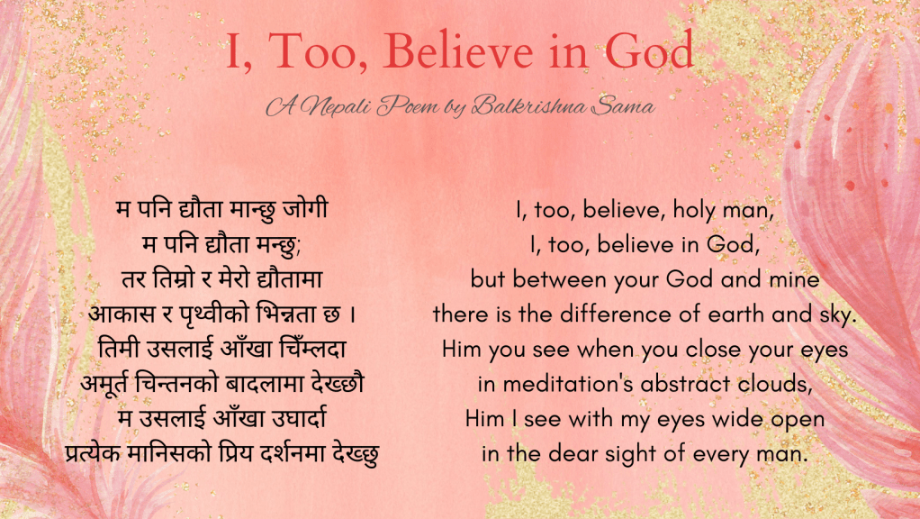 Bits, Pieces and Gems I too believe in God! Posted by Promod Puri on February 4, 2022 By Balkrishna Sama, a poet from Nepal Share this: Share on X (Opens in new window) X Share on Facebook (Opens in new window) Facebook Like Loading... Related
